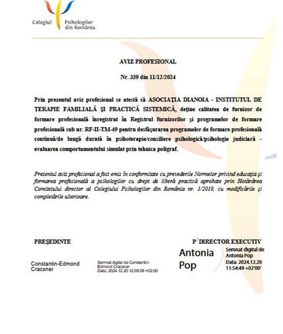ASOCIATIA DIANOIA, INSTITUTUL DE TERAPIE FAMILIALA SI PRACTICA SISTEMICA DIANOIA 2026-2027
